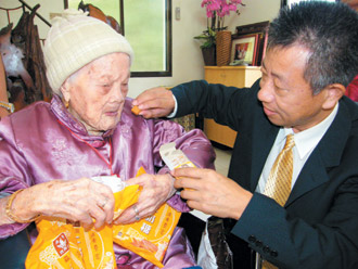 副縣長陳興照等人昨天探視老奶奶,為她戴上金鎖片,祝她重陽節快樂,老奶奶歡喜迎接客人,看到廠商送來6大箱不同口味的牛奶糖,更是笑開懷。