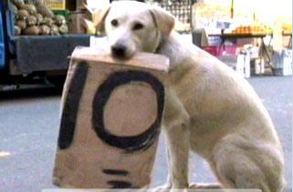 云林土庫傳統市場的Lucky狗,本事可不小,主人擺攤,它就咬著“每把10元”的大招牌坐在椅子上,一動也不動達2小時之久。