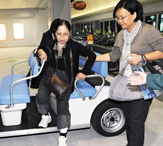 陳樹菊昨天搭機赴美領獎,因蜂窩性組織炎不良于行,桃園機場昨晚特別用電動車,把她從長榮航空貴賓室送到登機門。圖片來源:臺灣《聯合報》
