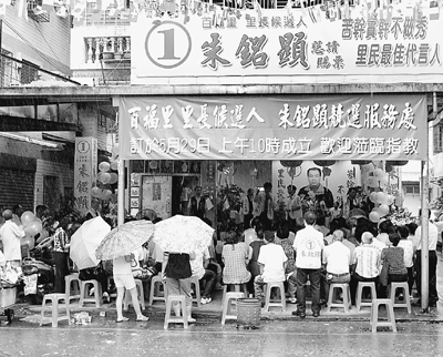 臺北縣汐止一處里長候選人總部舉行成立儀式,吸引了不少民眾觀看。