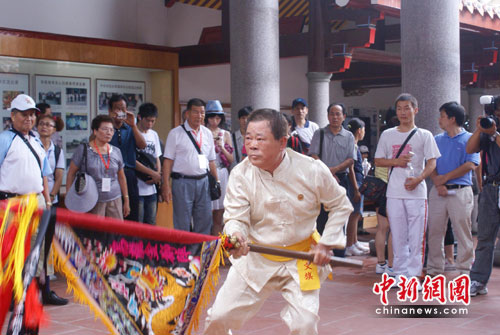 國(guó)際級(jí)九段武術(shù)裁判、臺(tái)灣國(guó)際武術(shù)總教練楊文旗已是第三次到永春拜祖了。去年參加首屆海峽論壇,楊文旗有機(jī)會(huì)到永春,并尋找了根:“自己家族傳承了110多年的武術(shù)就是永春白鶴拳”,他便與永春結(jié)下了難解之緣。這次,楊文旗和弟弟特地從臺(tái)灣帶來(lái)了“七星旗”,并在白鶴拳創(chuàng)始人方七娘塑像前行起了寓意對(duì)祖上長(zhǎng)輩無(wú)比尊敬的“七星旗”大禮。