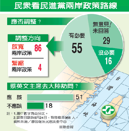 隨著陳菊訪問大陸,民進黨的兩岸政策路線成為新的話題。調查顯示,五成五民眾認為民進黨有必要調整對大陸政策,一成六覺得無此必要;其中,認為民進黨應調整路線者,八成六主張民進黨放寬兩岸政策,僅百分之四覺得應更為緊縮。