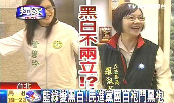據臺灣TVBS電視臺報道,臺灣“立法院”議場以后恐怕會變成“黑白分明”,國民黨“立法院”黨團發給“立委”的戰袍背心是黑色,民進黨團原本是灰色,“立委”陳瑩幫大家統包新的戰袍,挑中米白色。