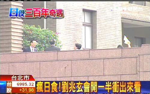 中新網7月22日電 據臺灣媒體報道,盡管臺灣只能看到日偏食,但民眾“追日”熱情高漲,政治人物也不例外。臺當局“行政院長”劉兆玄與副手邱正雄等人今天上午在辦公室開會,剛到一半就沖到二樓陽臺看熱鬧。