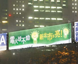 此外,板橋火車站旁客運站上方,上周六出現一面“電火球不點、新北市不亮”大型廣告牌,勸進蘇貞昌參選新北市長,臺北縣府雖覺得刺眼,昨天仍核準該廣告。