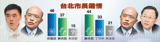 除了郝龍斌尋求連任,丁守中也傳出有意競逐臺北市長寶座。不過,若國民黨改由丁守中出馬,則藍營優勢不再,蘇貞昌支持度四成四,領先丁守中十一個百分點,另有二成一未決定。