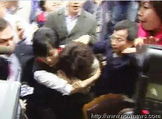 混亂中民進黨籍“立委”邱議瑩被國民黨籍“立委”呂學樟推倒。國民黨籍“立委”徐少萍則是從背后熊抱民進黨籍“立委”林淑芬,兩人因為重心不穩跌倒在地上,徐少萍還堅持不放手,十分拼命。