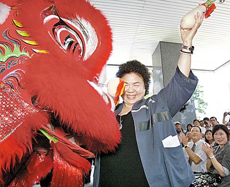 高雄市政府4日舉行水陸觀光車鴨子船掛牌儀式,舞獅送上好彩頭給市長陳菊。