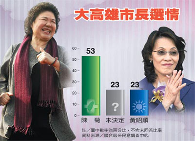 報道說,調(diào)查發(fā)現(xiàn),陳菊親民形象較黃昭順略勝一籌。55%選民對于陳菊有好印象,19%不喜歡她;相對來說,喜歡和不喜歡黃昭順的選民各占32%與19%,48%沒有深刻印象。從現(xiàn)階段支持率來看,陳菊目前獲得53%選民支持,黃昭順支持率23%,僅23%未決定。進一步分析顯示,陳菊不僅在泛綠及中立選民獲得壓倒性支持,即便是泛藍支持者,也有25%屬意陳菊擔任大高雄市長。