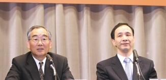 臺“行政院副院長”朱立倫(右)與“經建會主委”蔡勛雄(左)昨天舉行記者會,回應民進黨主席蔡英文的“近利說”。圖片來源:聯合報