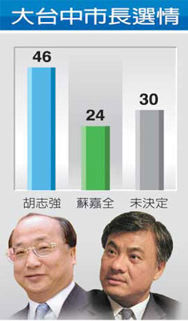 臺中市長選情民調:胡志強46% 蘇嘉全24%(圖)