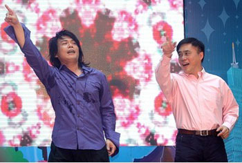 中新網5月19日電 據“中央社”報道,臺北市將舉辦花卉博覽會,藝人伍佰19日身披紙制環保“太空戰警裝”化身“i花博”環保親善大使,與臺北市長郝龍斌大跳招牌花朵舞。伍佰高唱“你是我的花博”,強調愛地球、做環保,要“不眠也不休”。