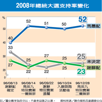 報道說,和八月中謝蘇配成局和馬特別費案一審宣判無罪時的調查相比,看好馬蕭配較有當選機會的民眾分別由三成三、四成六,上升到這次調查的四成九;覺得謝蘇配較有勝算者則由二成三、一成九,下滑到一成六。