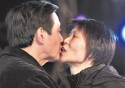 中新網(wǎng)2月15日電 據(jù)臺灣中國時報報道,常給人酷酷形象的周美青,一直未在“大選”時出面助選,十四日情人節(jié)晚上首度和馬英九同臺,兩人三度擁吻,合唱“今天你要嫁給我”,還感性推銷馬英九雖不懂人情世故,但正直、善良、敦厚、溫和、認真、負責。