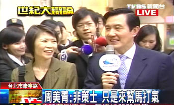 此次辯論會,周美青一樣參與了討論,也一樣非常地嚴格。她建議馬英九,多說一些小老百姓日常生活關心的話題,講述過程要簡單,賣弄文字得避免,最重要的是不可長篇大論。當記者詢問選戰(zhàn)是否應偏向政策討論勝于口水戰(zhàn),她回答馬一直都沒打口水戰(zhàn)。
