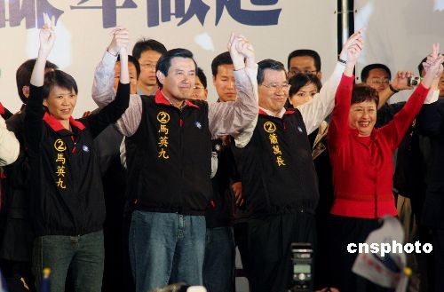 馬英九夫婦和蕭萬長夫婦在競選總部前的集會上,與支持者共同慶祝勝選。中新社發 黃少華 攝