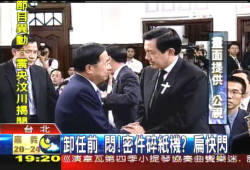 中新網5月15日電 5月20日臺灣當局將進行權力交接。即將卸任的陳水扁和就要接棒的馬英九,14日在柏楊追思會上相遇。陳水扁與馬英九碰頭后,兩人除了進出場兩度握手后,沒有其它互動。
