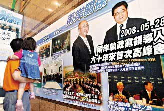 國民黨中央一樓大廳即日起展出胡連會、胡吳會等會談照片,這也是胡錦濤照片第一次出現在國民黨中央并公開展出。 臺灣《聯合晚報》圖