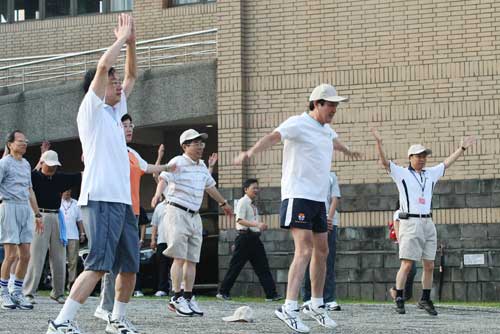 馬英九(前右二)七月二十五日在陽明山上,與臺行政當局高官們一起做早操。(“中央社”圖)