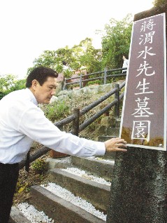 但因墓前傾頹敗破,磚石廢物垃圾雜亂堆置,要前往追思無路可循,因此蔣渭水之孫蔣朝根今年四月向馬英九反映,馬英九再轉告知臺北市府,重新規劃新步道。因此馬英九今天是修葺完成后特別前往追念,這也是臺灣地區領導人第一次到蔣的墓前瞻仰致敬。