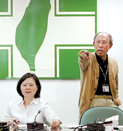 民進黨秘書長王拓(右)傳出倦勤消息,但他否認已提辭呈,將等蔡英文(左)回臺后再討論更適合人選接任。圖為兩人參加黨內會議。