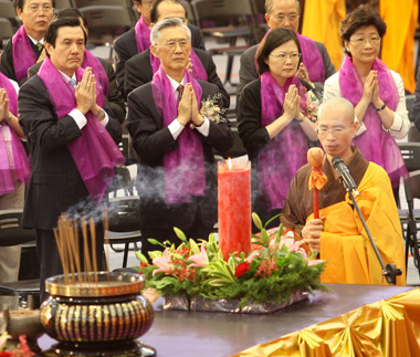 參加法會,馬英九沒談政治,記者沒機會問他和蔡英文同臺尷不尷尬,不過答案恐怕也是阿彌陀佛。