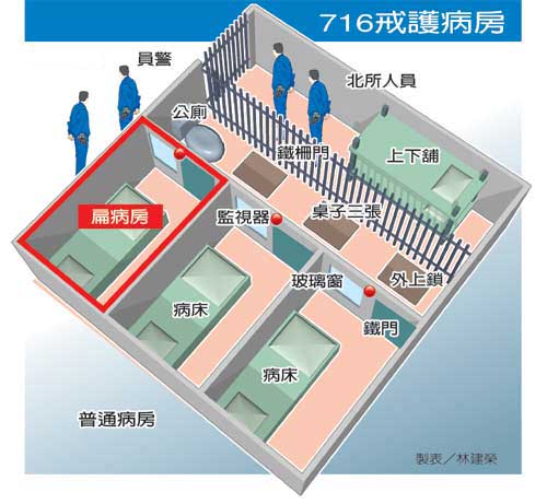 板橋醫院戒護病房是將七一六號病房另設門戶,在走廊盡頭設置一道電動玻璃鋁門隔開,另以兩道鐵柵門將內部隔出看守所人員休息區、戒護區,其余空間再分隔成三間每間不到兩坪大的單人房,每間單人房的鐵板門自外上鎖,看守所人員可從墻面的一道玻璃窗察看,每間小病房天花板都有一座監視器。