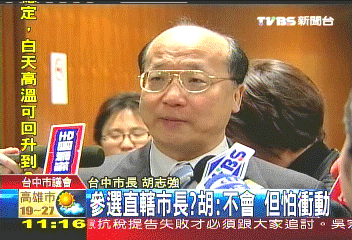 中新網11月21日電 據臺灣TVBS報道,2010年臺中縣市將合并“升格”為“直轄市”,到底臺中市長胡志強會不會參選“直轄市長”?胡志強表示,他理性、平和、冷靜的跟大家說,他不會參選,但就怕大家逼他,讓他太沖動,此話一出,又讓大家留有想象空間。