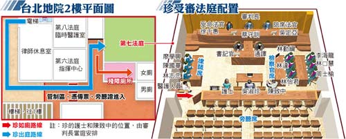 合議庭考慮吳淑珍身體狀況,預(yù)計這兩天各開庭4小時。法院也開放第八法庭給臺大醫(yī)院放置臨時病床、心電觀察儀器和呼吸器材,兩名醫(yī)師、兩名護(hù)士也可在此休息,法院外也將有救護(hù)車待命。由于臺大仍認(rèn)為吳淑珍不適合長時間坐著,合議庭今將每30分鐘讓她休息一下,由醫(yī)護(hù)量心跳及血壓,她若有需要,可在被告席桌下擺一臺電暖器保暖。