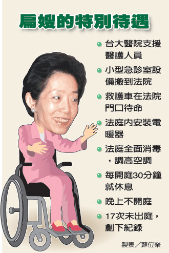 2006年12月15日機要費案首次開庭,吳淑珍即因身體不適昏倒送醫,迄今已有17次請假不出庭紀錄,消失787天的她在10日出庭會有什么表現?身體情況如何?都成為外界矚目焦點,扁委任律師石宜琳9日傍晚轉述陳水扁的話指出,她以前在家中,“就常出現前一分鐘還有說有笑,后一則鐘就突然昏倒”。