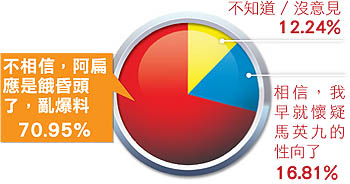 除此之外,臺(tái)灣《蘋(píng)果日?qǐng)?bào)》還做了民意調(diào)查,結(jié)果顯示,70.95%的臺(tái)灣受訪民眾認(rèn)為關(guān)于馬英九同性戀的說(shuō)法是陳水扁餓昏了頭亂爆料,只有16.81的民眾表示相信此事。(韋博)
