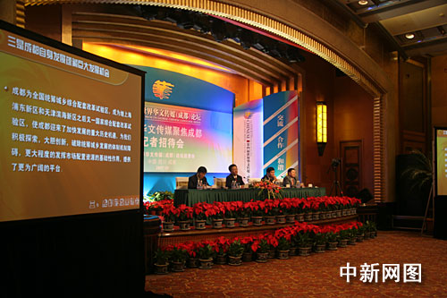 [中共成都市委常委、宣傳部長郝康理]: 各位新聞界的朋友們,女士們,先生們,大家下午好。時值金秋九月,美麗的蓉城榮幸地迎來了第四屆世界華文傳媒論壇的舉行。為了讓廣大海外媒體更好地了解成都,今天我們專門在此舉行“世界華文傳媒聚焦成都”專題記者招待會,由成都市領導向各位記者介紹成都市的基本情況,以及成都市舉辦本屆世界華文傳媒論壇的相關情況。出席今天記者招待會的領導有:中共成都市委副書記、成都市市長葛紅林先生;成都市委常委孫平先生,成都市副市長何華章先生,以及成都市發展改革委員會、投資促進委員會、商務局等部門的負責人。除了參加本屆論壇的海外記者出席記者招待會外,還有國內外眾多的媒體記者參加招待會,在這里向大家表示熱烈的歡迎。為了讓第一次光臨成都的媒體朋友充分了解成都,首先請大家看張藝謀導演拍攝的宣傳片,《成都—一座來了就不想離開的城市》。 |