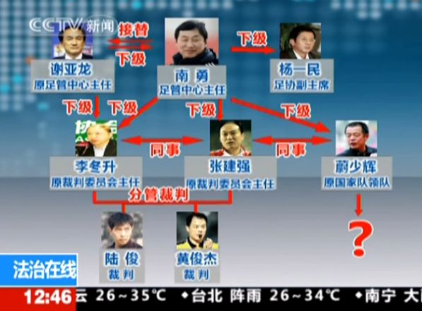 2010年1月21日,公安部證實中國足協(xié)南勇、楊一民和張建強三名高官被帶走協(xié)查,這證明中國足球的“反賭掃黑”進入了“反腐”的新階段。至此,足協(xié)高官的涉案關系網逐步被揭開。