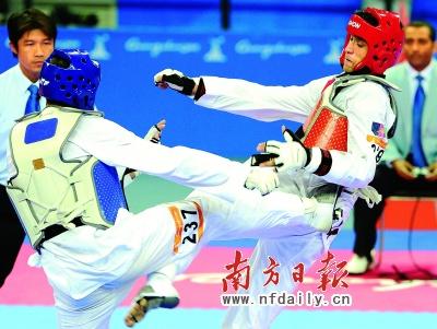 在跆拳道男子80公斤以下級決賽中,阿富汗選手內薩爾·艾哈邁德·巴哈維(右)以3比4負于約旦選手納比勒·哈桑,獲得亞軍。 新華社發
