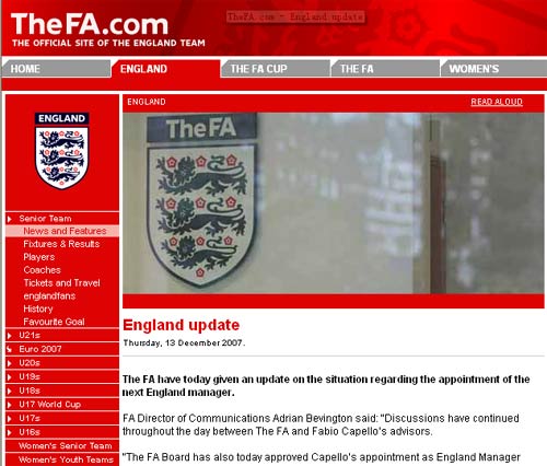 中新網(wǎng)12月14日電 萬眾聚焦的英格蘭選帥今天終于接近水落石出,英格蘭足總今天凌晨在其官方網(wǎng)站上透露了選帥的最新進展,卡佩羅入主已基本定局。