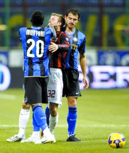 比賽的另一個(gè)焦點(diǎn)就是處于轉(zhuǎn)會(huì)漩渦中的貝克漢姆。留守米蘭受阻明顯影響到了貝帥的心情,開賽沒多久小貝就和國米的蒙塔里發(fā)生了小摩擦,倒霉的小貝還被對手掐了脖子,不過主裁判并沒有任何表示。更倒霉的是第57分鐘,小貝因?yàn)橛掖笸燃∪饫瓊坏貌惶崆跋聢觥?/p>