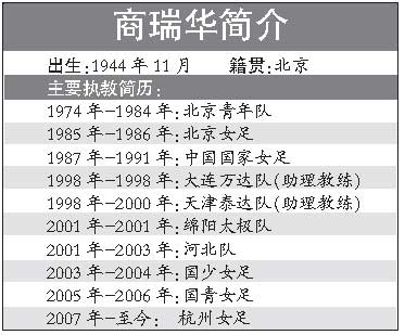 商瑞華是中國女子足壇的元老級人物,中國女足運動開端之后的優秀球員均在其手下效力過,包括李秀馥、吳偉英、劉愛玲、溫莉蓉、孫雯等人。雖然在率隊參加的1991年首屆女足世界杯賽上,中國女足因負于瑞典隊而無緣4強,但這支國家隊奠定了中國女足在1996年、1999年兩奪世界亞軍的基礎。離開主教練崗位后,商瑞華曾先后以助理教練的身份執教男足的大連萬達隊、天津泰達隊,擔任過四川綿陽隊主教練,隨后又任職河北女足、中國女足青年隊,目前在杭州女足任教。
