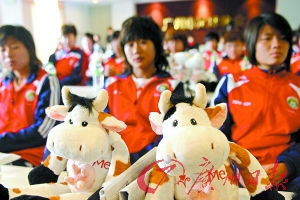 昨天是圣誕節,正在廣州集訓的中國女足首次亮相越秀山體育場。在參加由四國女足邀請賽冠名贊助商南方人才市場主辦的新聞發布會時,球員們收獲了一份意外的“圣誕禮物”:身上印有“kiss me (親我)”英文字樣的奶牛公仔。贊助商這一別出心裁的禮物,讓包括韓端、畢妍在內的女足姑娘們個個愛不釋手。