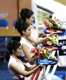 不少禮儀小姐通過“好運北京”奧運測試賽進行了實戰演練。參加曲棍球比賽頒獎的劉暢文告訴記者:“我端的托盤里裝著18塊曲棍球比賽的金牌和1個獎杯,估計至少有10公斤重。一開始我的手都是抖的,我當時特別害怕手抖得太厲害會使獎牌掉下來,不過我最終還是堅持下來了!”