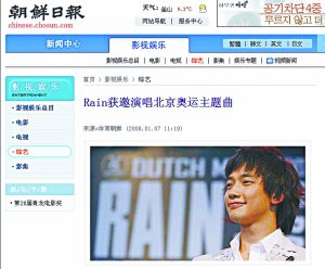據前日的《朝鮮日報》報道稱,韓國藝人Rain(鄭智熏)獲邀演唱北京奧運主題曲。朝鮮日報報道稱:“據悉,北京奧委會2007年曾向Rain發出邀請,希望他能夠演唱奧運主題曲!璕ain欣然接受了邀請,目前正在與北京奧委會(注:應為北京奧組委)方面談具體事宜。”