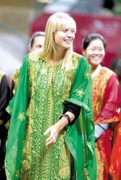 昨天WTA一級賽卡塔爾公開賽開賽儀式上,參賽女選手身著卡塔爾民族服裝亮相,莎娃在其中更是亮麗出眾。