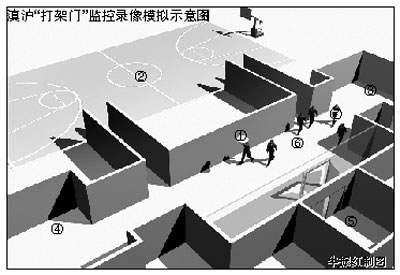①監(jiān)控錄像攝像頭。②星耀籃球場(chǎng)。③客隊(duì)更衣室。④主隊(duì)更衣室。⑤電梯。⑥攝像頭監(jiān)控區(qū)域。⑦走出更衣室的上海隊(duì)球員。