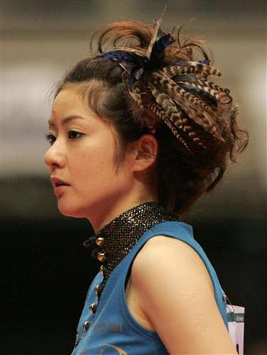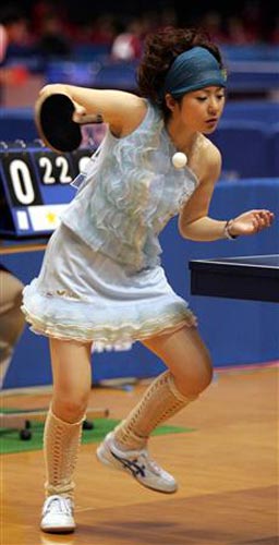 在日本乒壇,福原愛(ài)名聲最大,其次就是有著漂亮臉蛋、性感身材的四元奈生美了。今年30歲的四元在日本的影響并不比福原愛(ài)低多少。從2007年的全日本乒乓球錦標(biāo)賽至今,這位美女球員每次比賽都會(huì)換上不同的時(shí)尚超短裙,或是露出香肩的吊帶衫參賽。而且,她的頭飾也都是經(jīng)過(guò)發(fā)型師精心設(shè)計(jì)的,爆炸式、淑女式……總之,五顏六色的服裝+各類(lèi)怪異的發(fā)型+比賽場(chǎng)上揮拍動(dòng)作都是那么的迷人,相比于其他運(yùn)動(dòng)員的一臉嚴(yán)肅,四元奈生美在賽場(chǎng)上刮起的時(shí)尚之風(fēng)迷倒了很多日本男球迷。