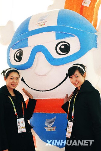 2月17日,禮儀小姐在亞布力滑雪場與吉祥物“冬冬”合影。新華社記者徐家軍攝
