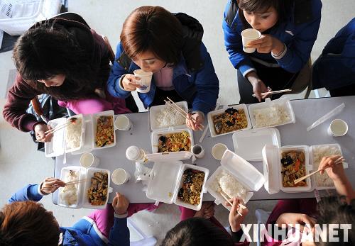 圖為“籃球寶貝”們在比賽前吃盒飯。(3月1日攝)新華社記者李鋼攝