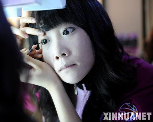 圖為一名“籃球寶貝”在比賽前化妝。(3月1日攝)新華社記者李鋼攝
