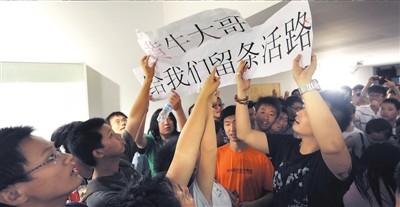 昨天上午11點,300余名國安球迷涌入國安足球俱樂部內短短二三十米長的通道,他們高舉著“黃牛大哥,給我們留條活路”的標語,情緒十分激動,抗議“黃牛”壟斷門票,要求俱樂部保障球迷的利益。由于人數眾多,現場的暖氣片也被球迷擠壞,暖氣管道里的水灑了一地,廢棄的飲料瓶等雜物也隨處可見。陸續有數名民警趕到現場維持秩序,防止球迷出現過激行為。