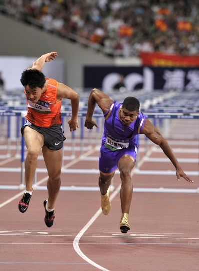 9 點35分,劉翔終于進入體育場,和其他8名選手一起在跑道外候場。這時,男子百米飛人大戰的選手已經蹲在起跑器上,其中包括前世界紀錄創造者蓋伊和鮑威爾。然而,劉翔的出現讓這場世界一流的百名飛人大戰變得黯淡,全場所有的注意力都集中到了場邊的劉翔,觀眾對著劉翔的方向一陣狂吼。