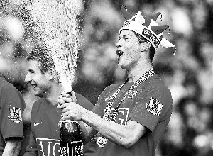 曼聯隊C羅開香檳慶祝勝利。