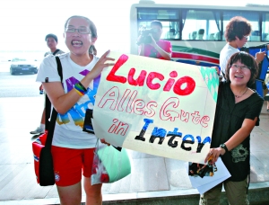 本報訊 藍色軍團球迷在等候接機的時候“曬”珍藏的球衣。一位說:“我家里的國米球衣,印的還是阿德里亞諾。”另一位安慰他:“我前幾天剛買了國米的球衣,還特意拿去印號,唉,印的是克魯斯。”阿德早就離開國米,而克魯斯則在4天前投奔拉齊奧。